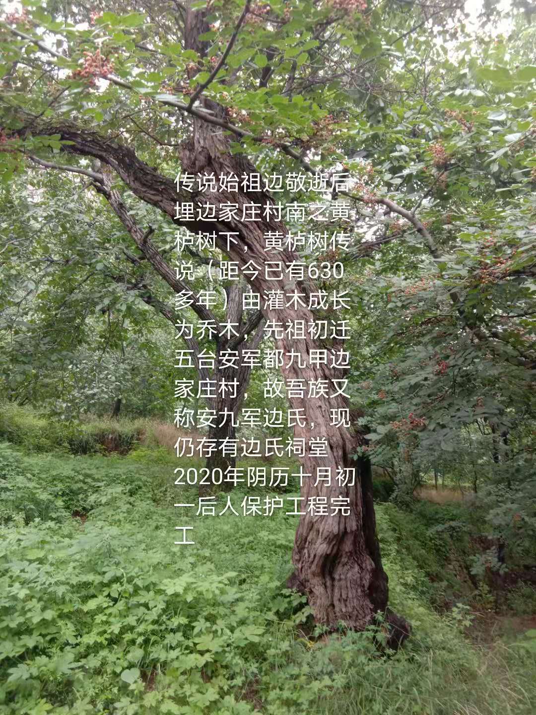 黄栌树是位于山西省忻州市五台县边家庄村边氏祖坟,距今已有630年历史。在代县边永升大力支持下,边锁堂,边秀堂,边静英的共同组织下,边锁堂扎实工作,辛勤劳动在二零二零年农历十月初一顺利完成。黄栌树的保护为我们边氏后代树立了光辉的榜样,非常感谢边永升感念祖恩,传承香火,兴隆宗族的这一壮举,感谢乡亲们的辛苦工作。保护祖坟黄栌树只是迈出了第一步,倡议边氏宗亲大家同心同德,慷慨解囊,下一步共同努力将边氏祠堂重新修建起来!