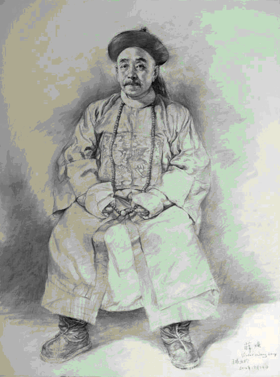 薛焕六世外孙美国芳邦大学美术系终身教授维克托.王根据英国1859年版《额尔金伯爵出使中国和日本之行记事》内薛焕像绘制