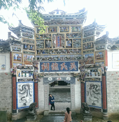 总祠前门牌楼全都是五彩缤纷的立体塑像。集人物花鸟、历史故事、民间传说于一体,千姿百态、栩栩如生。既古雅、又鲜艳,富含新意。牌楼的字画自上而下,从左到右为:天仙配、季札挂剑、文王访贤、刘海砍櫵、云长出关、罗通扫北、太君辞朝、句曲山、指日高升、泰伯流芳、天官赐福、马蹄炮、八仙过海、司马迁写史记、班超投笔从戎、天女散花、龙凤吉祥、嫦娥奔月、李白藐视权贵、屈原赋离骚、草桥关、吴氏总祠、天水关、张义钓龟、文姬归汉、吴盛像、白居易进长安、陶侃运砖。