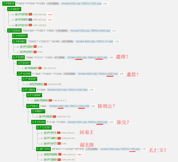 YFull树的F9935是F1319下游的主要支系,F10056正在其下游。如果F10056是虞舜世系,根据YFull计算的分化与共祖时间,我们大致可以作如下的推测:F3555可能是虞舜,F10356可能是帮助少康复国的虞国中兴之祖虞思,F8841可能是陈胡公,F13136可能是陈完。如果这个推测是对的,则F13136下游的河南王氏可能出自妫姓王氏(齐王),湖北陈氏出自陈完。可详见分支树。