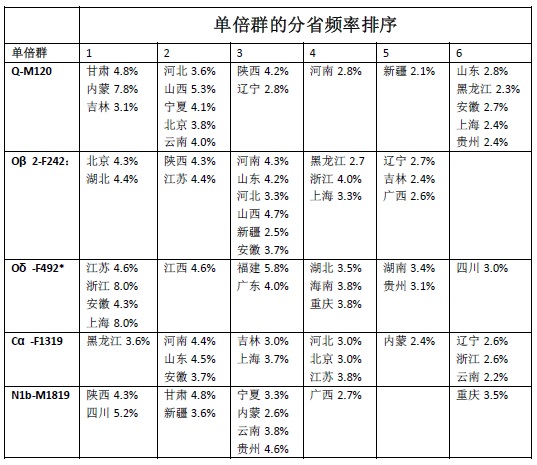 从DNA分布上看,Oβ2-F242和Q-M120的分布也很相似,都是全国性的,也都是北方多南方少。而Oδ-F492基本是南方分布,且在南方各省中优势十分明显,N1b-M1819基本上是偏西分布。在这五大单倍群簇分支中,只有QM120是唯一的一个进入传统北汉所有各省前六频率的单倍群!而且在南方各省分布中,除了福建、广东、广西和海南这沿海四省分布频率较低之外,其他各省的QM120频率也大多进入了前10大簇。另外,R系大单倍群在北方汉族中也表现不俗,显示汉人中的确有一定程度印欧种系人群融入(平均大约占中国人1-2%左右)。频率图乘上人口基数,就可以得到全省的实际人口密度分布图。具体见下表: